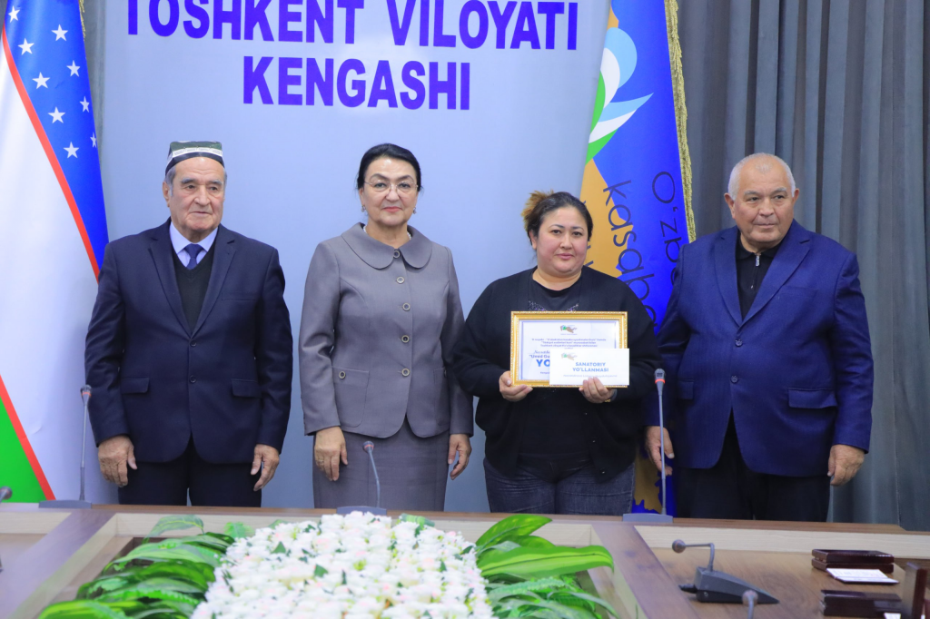 Shuningdek, yaqinlashib kelayotgan O‘zbekiston Respublikasi tibbiyot xodimlari kuni munosabati bilan viloyatdagi muassasalarda faoliyat yuritayotgan 10 nafar tibbiyot xodimlariga O‘zbekiston Kasaba uyushmalari Federatsiyasi Toshkent viloyati Kengashi tomonidan “Umid gulshani” hamda “Ko‘hinur” sanatoriylariga bepul yo‘llanmalar topshirildi.