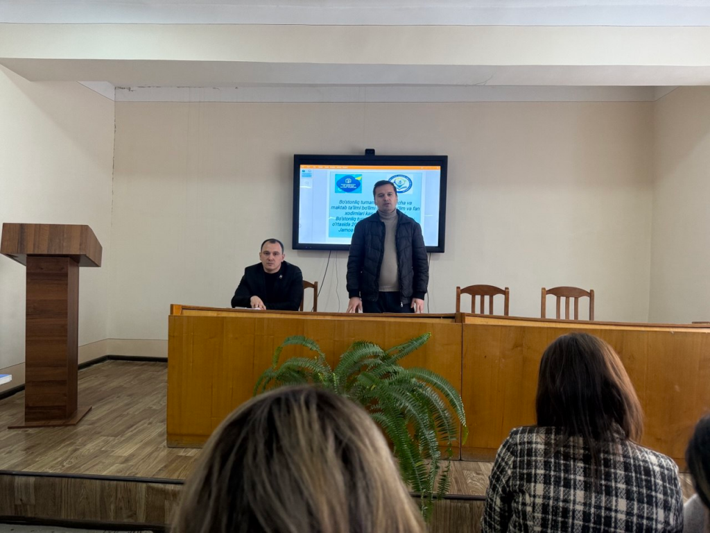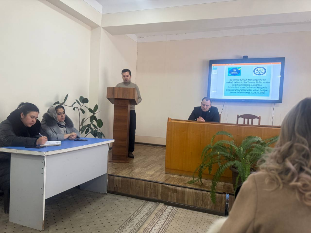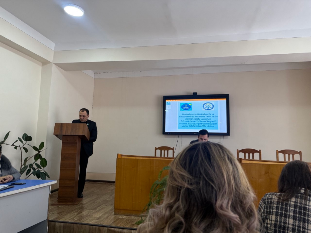 Bo’stonliq tumani Maktabgacha va maktab ta’lim bo‘limi hamda Ta’lim va fan xodimlari kasaba uyushmasi Bo’stonliq tumani bo‘linmasi kengashining 2023-2025 yillar uchun tuzilgan jamoa kelishuvining 2024-yildagi ijrosi bo‘yicha hisobot yig‘ilish bo‘lib o’tdi.